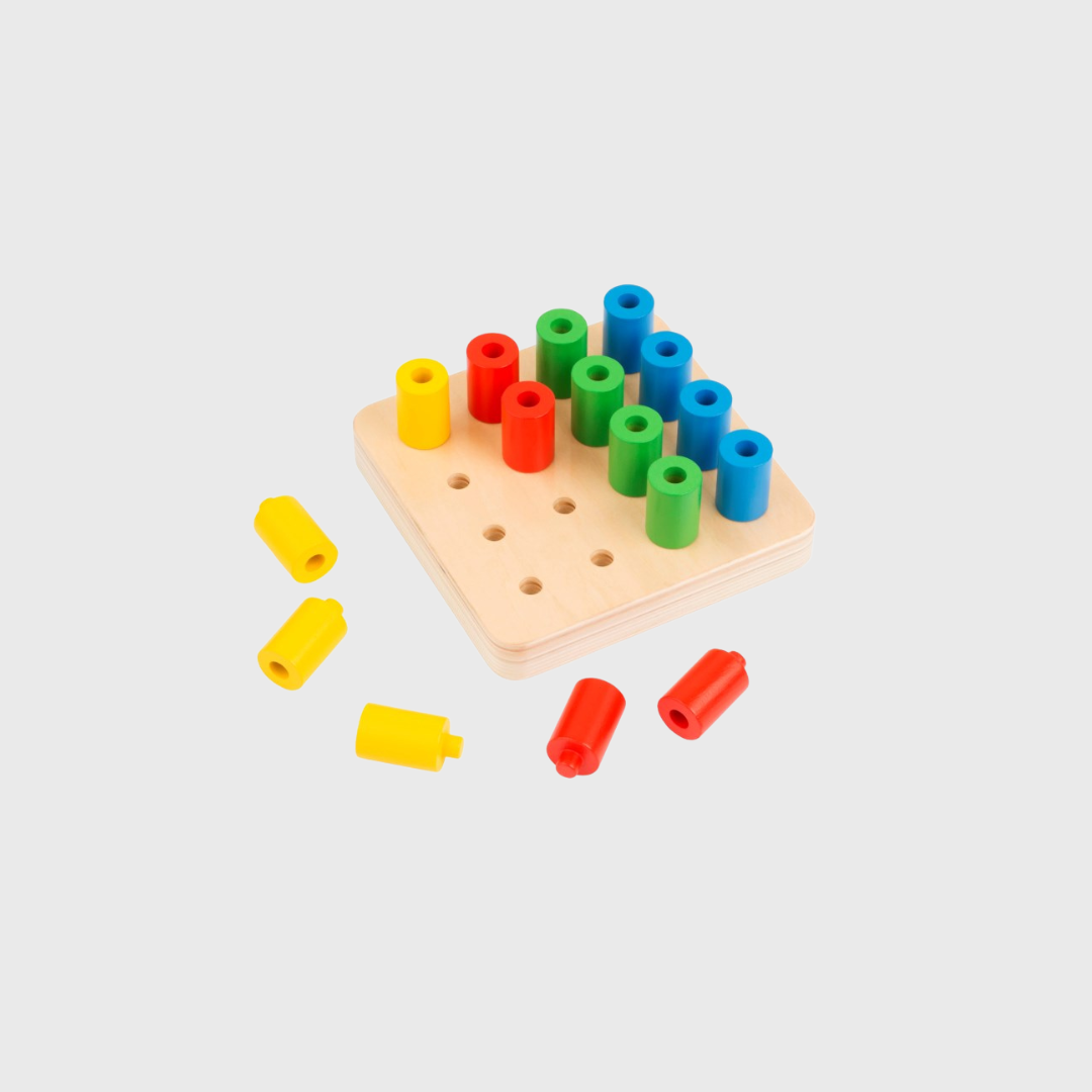 Sudėtis: medinė bazė su skylutėmis + spalvoti mediniai cilindrai.