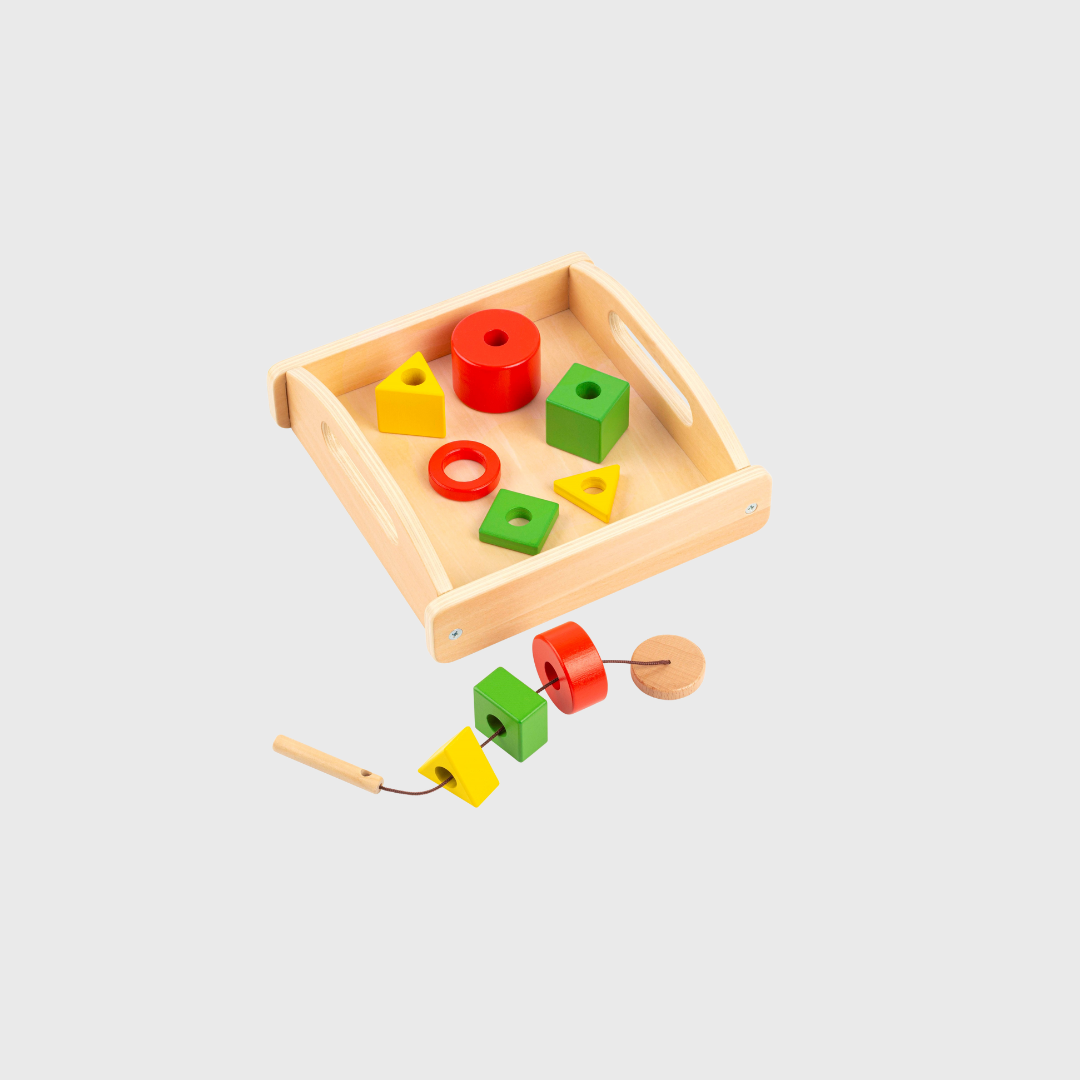 Su šiuo karoliukų vėrimo žaidimu vaikas lavinsis smulkiąją motoriką ir spalvų bei formų suvokimą. Karoliukai yra skirtingo storio, tad užduotis palaipsniui vis sunkėja.