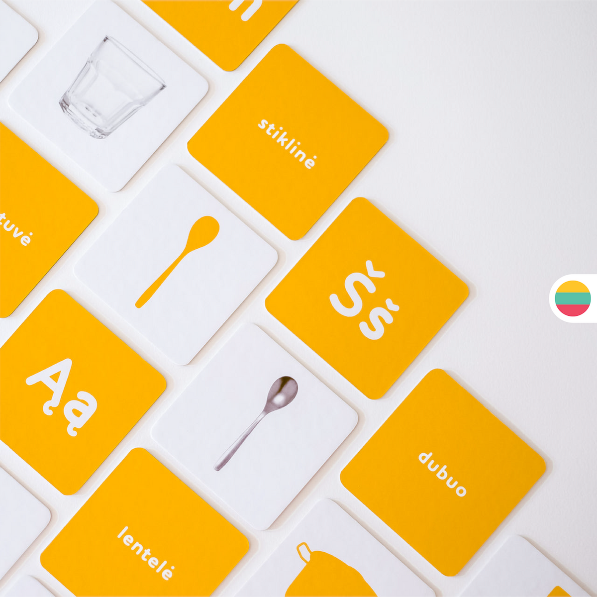 Kortelių rinkinys virtuvės objektų pažinimui, pastabumui lavinti bei raidžių ir skaitymo praktikai. 20 kortelių rinkinyje pavaizduoti 10 dažniausiai virtuvėje sutinkamų objektų, jų šešėliai, pirmosios raidės bei pilni pavadinimai.
