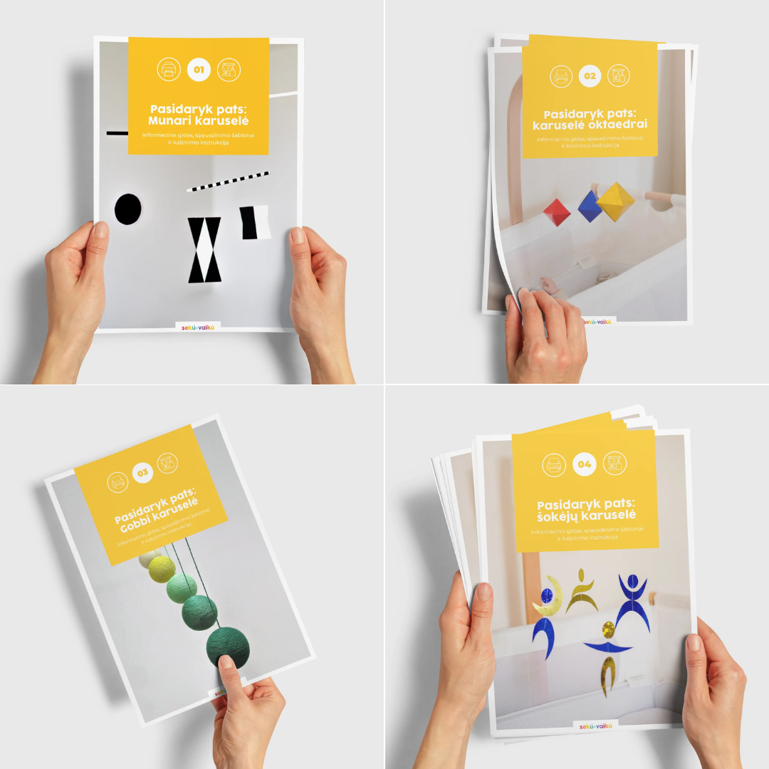 Šiame rinkinyje rasite visų keturiu Montessori karuselių šablonus bei instrukcijas pasigaminimui namuose.
