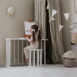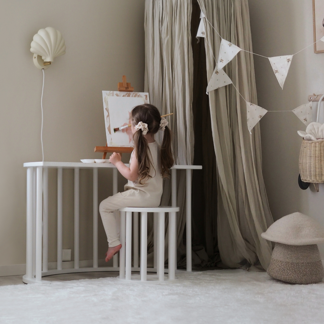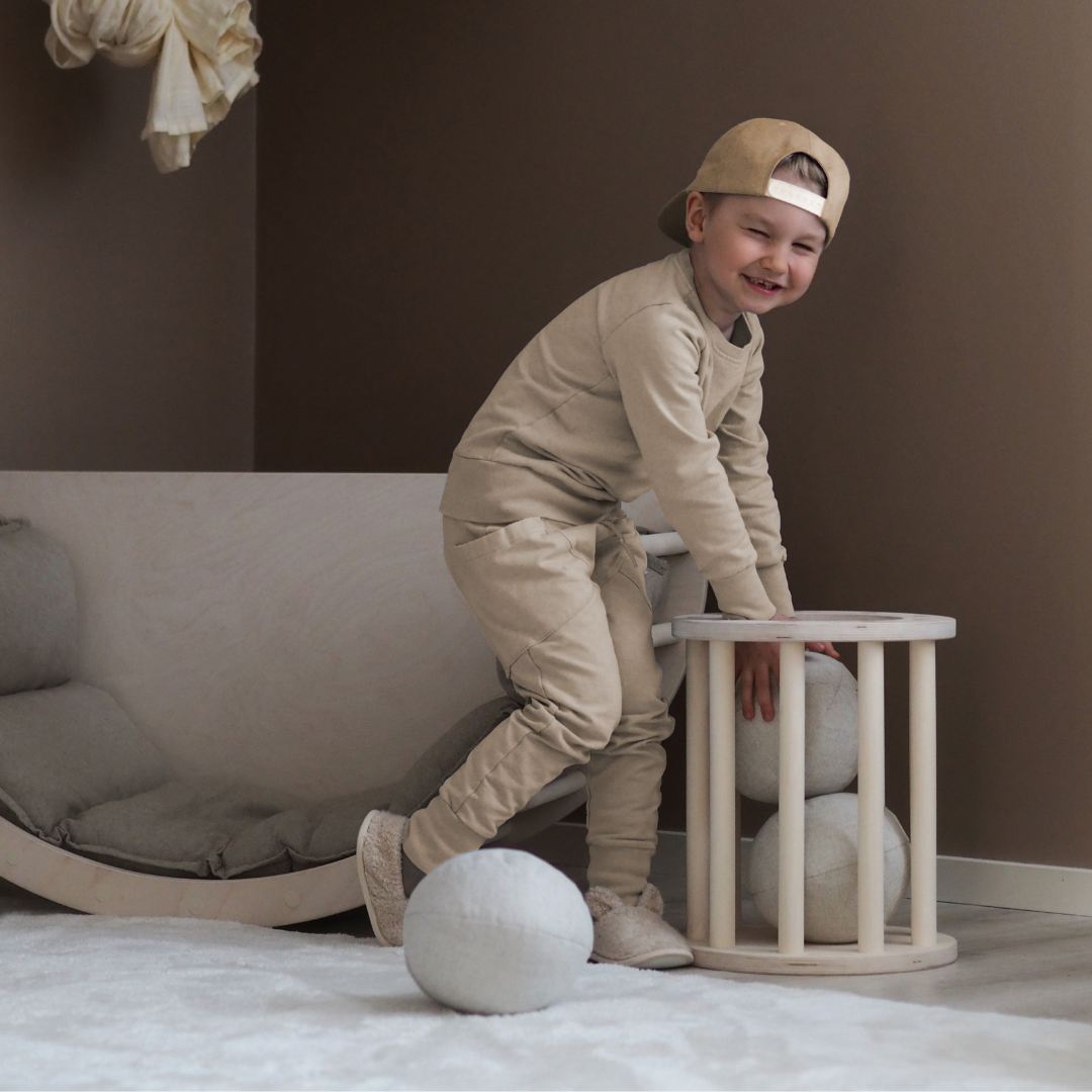 Ši taburetė yra universalus laipiojimo arkos palydovas. Kartu jie sukuria gražią darbo vietą, kuri idealiai tinka 6-11 metų vaikams, bet tai dar ne viskas. Apverskite ją aukštyn kojomis ir ji virs kamuoliukų mėtymo krepšiu, o tai papildys jūsų vaiko kasdienybę įdomiu aktyvaus žaidimo elementu.