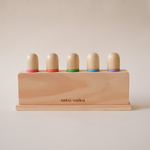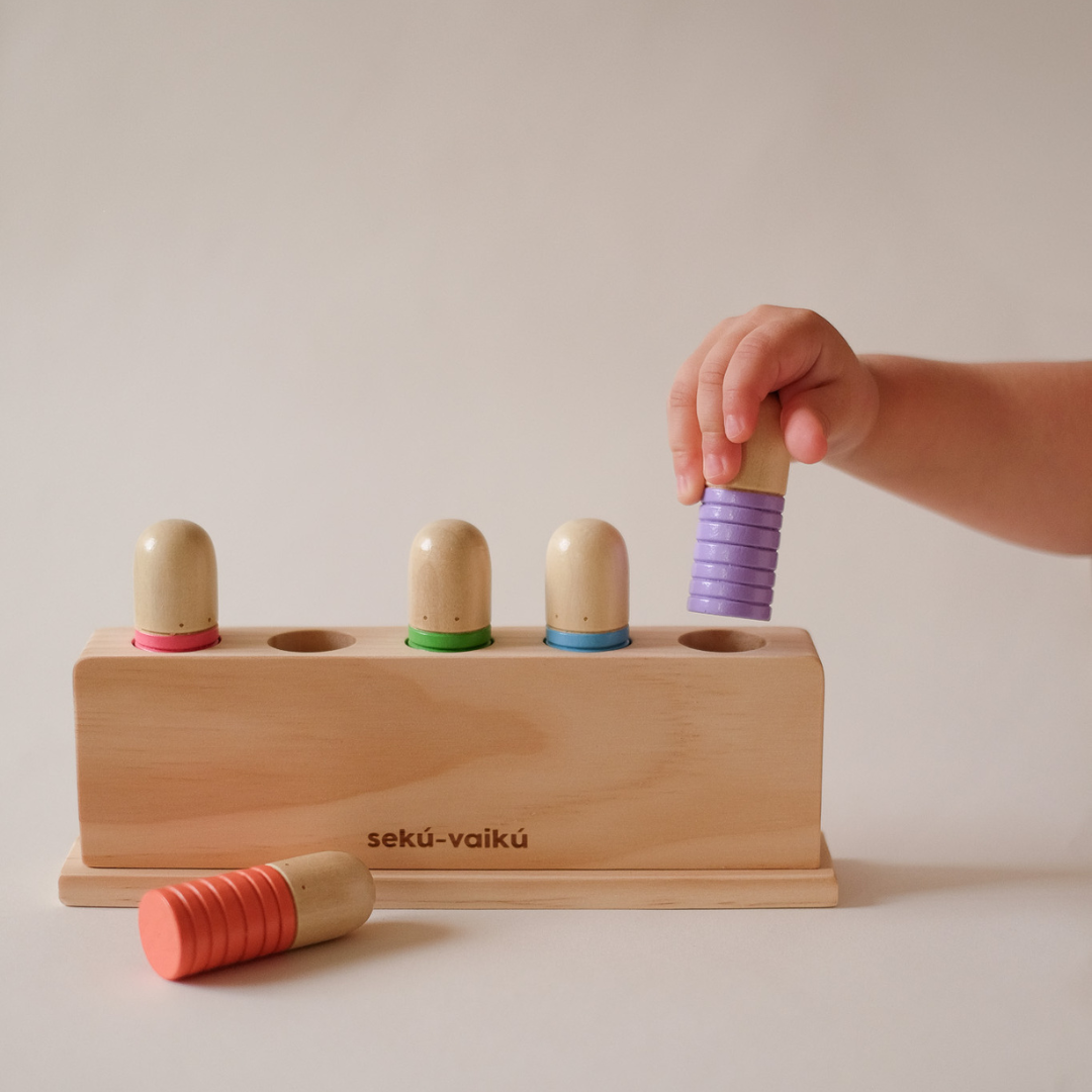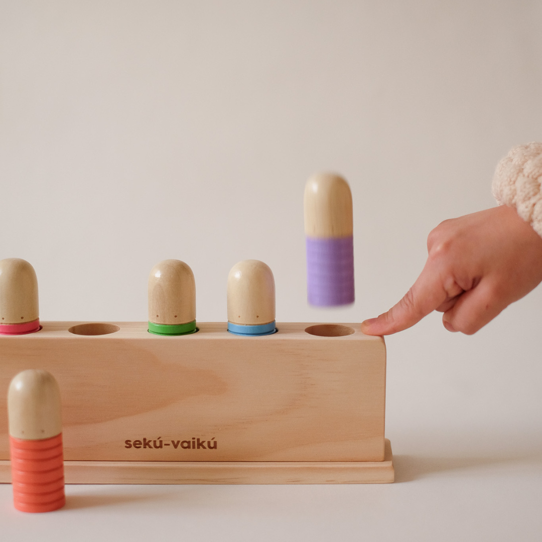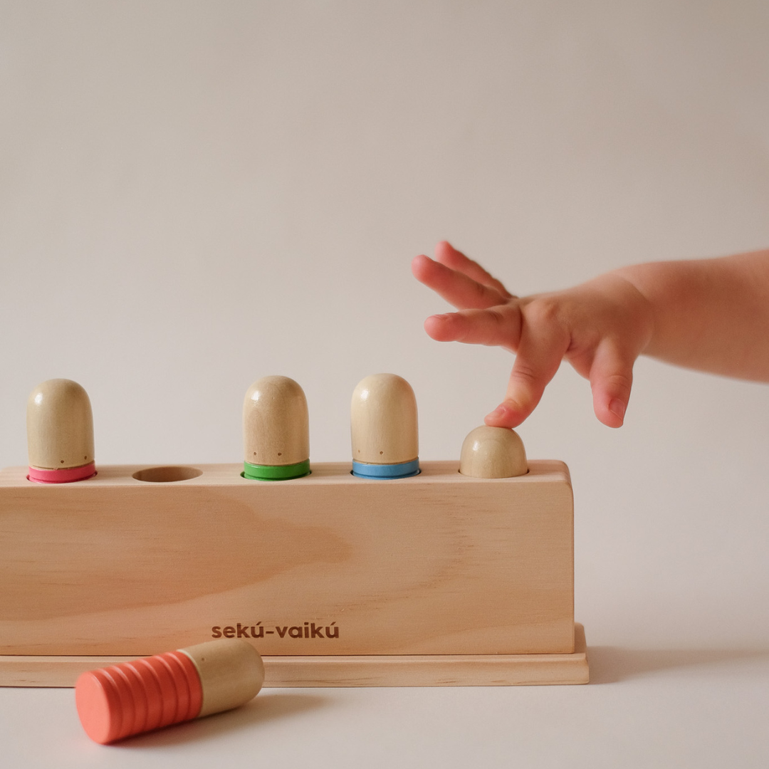 Montessori įkvėptas sensorinis žaislas, sukurtas skatinti smagų žaidimą ir lavinimąsi vienu metu. Kai vaikas paspaudžia žmogiuko galvytę, ji iššoka, suteikdamas malonų netikėtumo pojūtį, prie jo smagu sugrįžti žaisti vėl ir vėl, kaskart atrandant naujų žaidimo būdų.