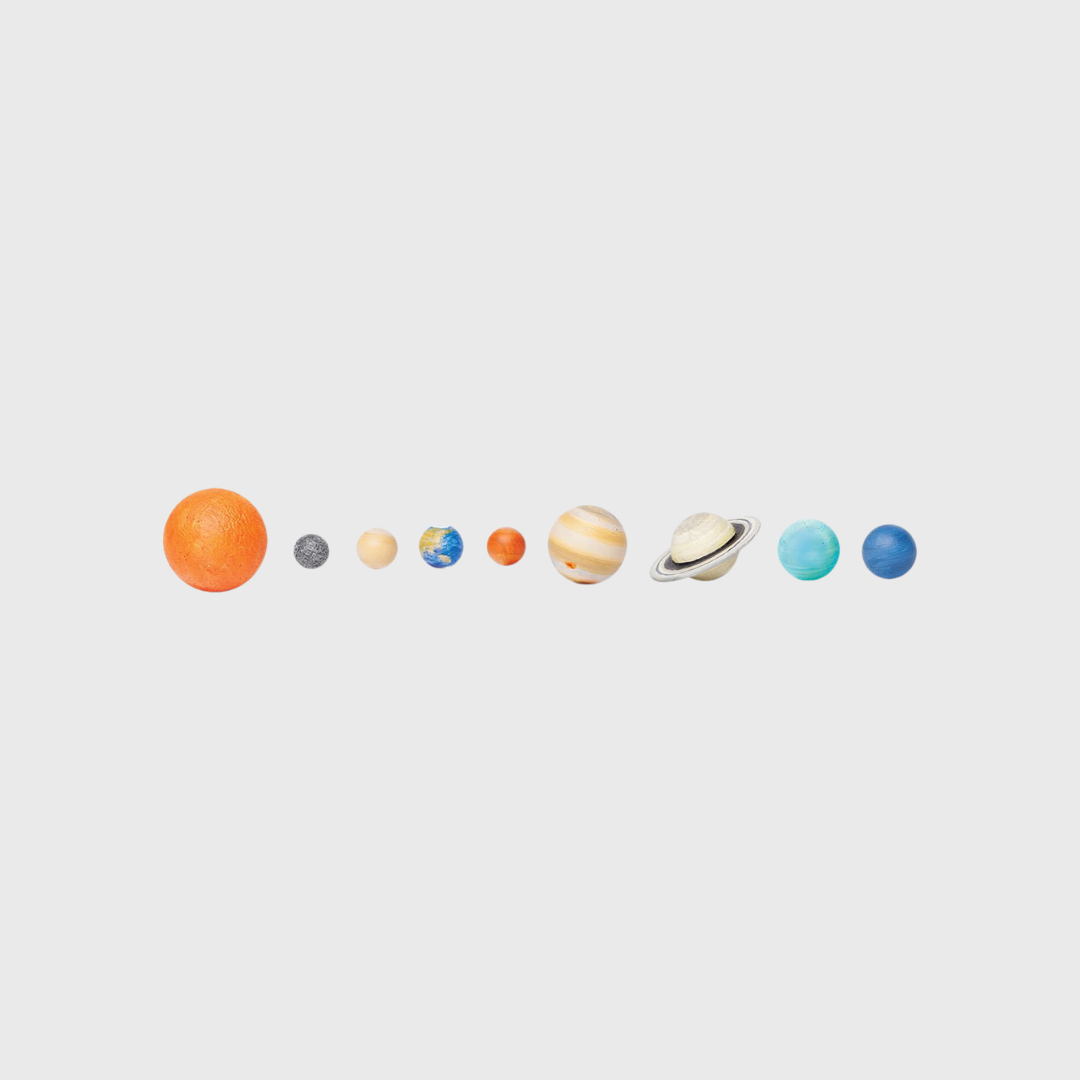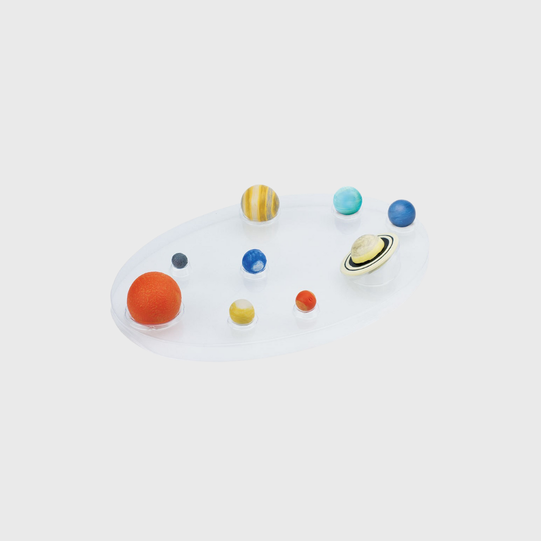 This is a detailed educational set about the solar system, designed to help you learn more about our cosmic neighborhood. The set includes the Sun and all eight planets, recreated in their true colors, proportions, and distinctive features—from Jupiter's Great Red Spot to Saturn's rings and Earth's polar ice caps. The figures can be played with separately or placed on a special tray that depicts the orbits of the planets around the Sun.