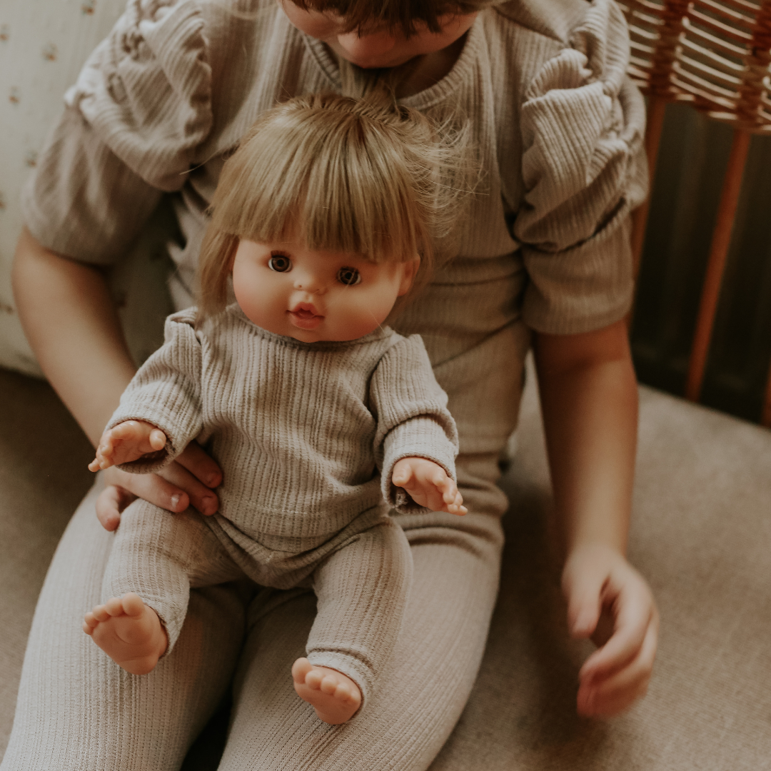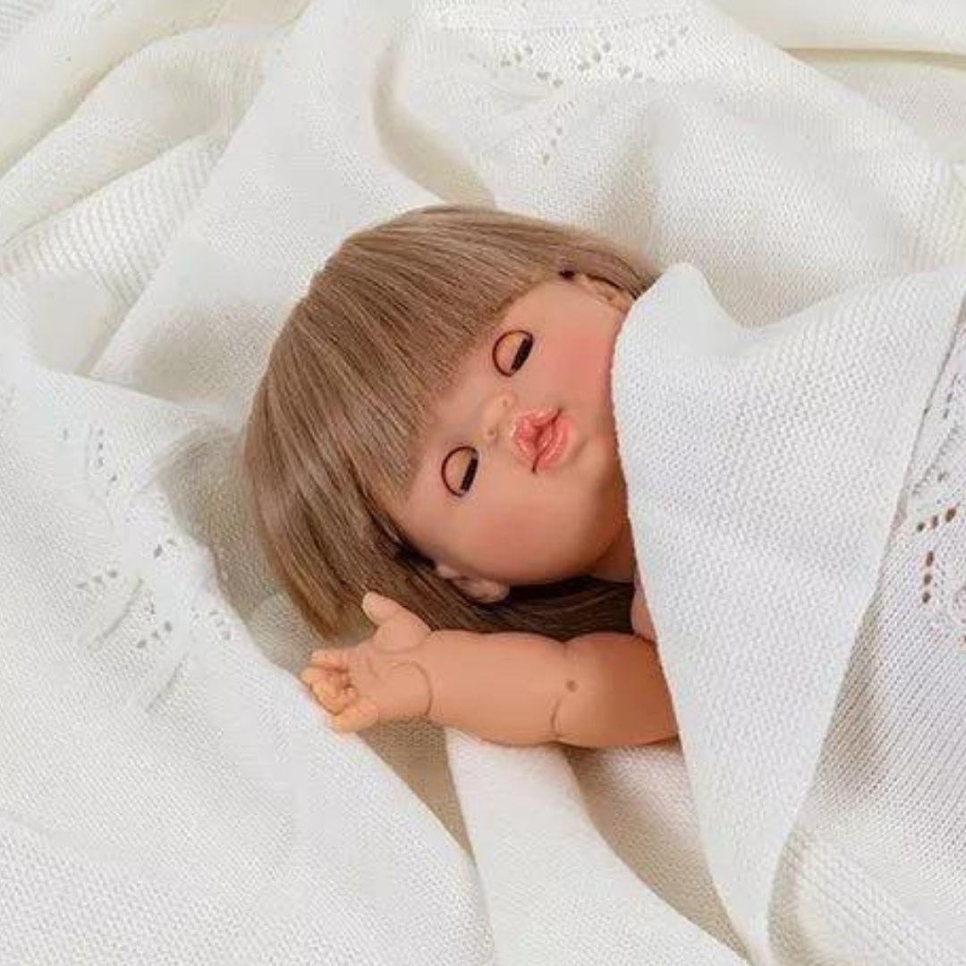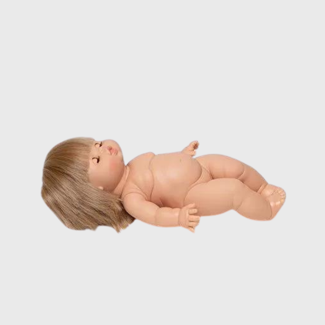 Unit price perMinikane 34 cm. The hard-bodied doll has a soft vanilla scent and can move its arms and legs, sit or lie down. This doll has charming eyelashes and closes its eyes when laid down. The hair can be combed, pinned up and tied.
