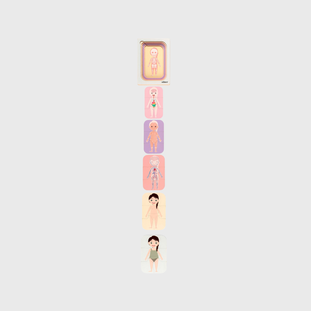 A 6-layer puzzle depicting the human body: skeleton, organs, muscles, and blood circulation. This is a great tool not only for puzzle lovers, but also for all children interested in the structure of the human body, body parts, and how the human body works.