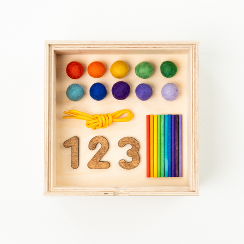 10 vilnos kamuoliukų (vaivorykštės spalvos), medinis pincetas, raištelis varstymui, 100 medinių pagaliukų (vaivorykštės spalvos) ir skaičiai bei ženklai dėlionei. Rinkinyje taip pat rasite dvi gumeles, jei reikėtų papildomo stabilumo ar lentelės fiksavimo.