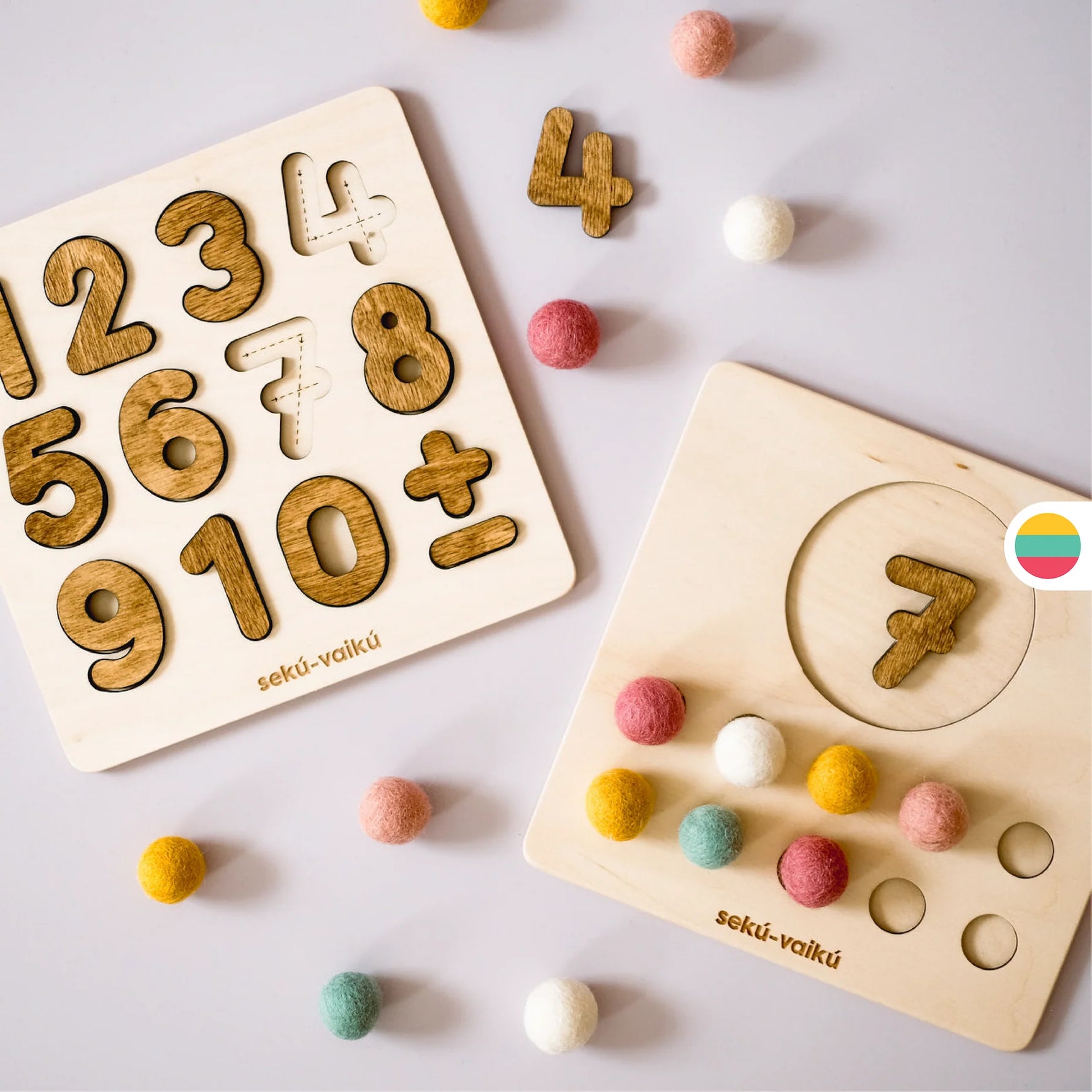 - dėlionę su skaičiais nuo 0 iki 10 bei matematiniais ženklais;