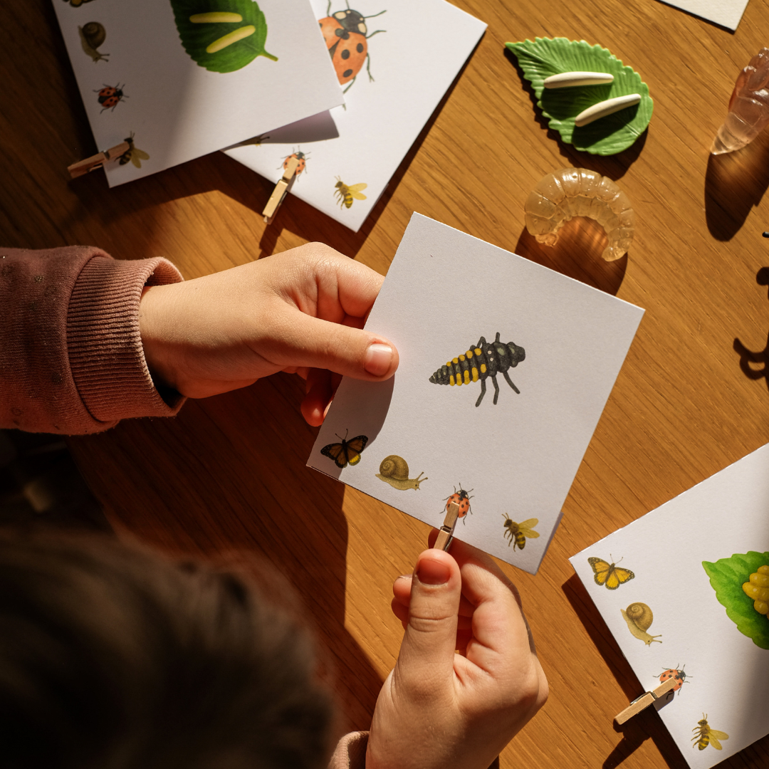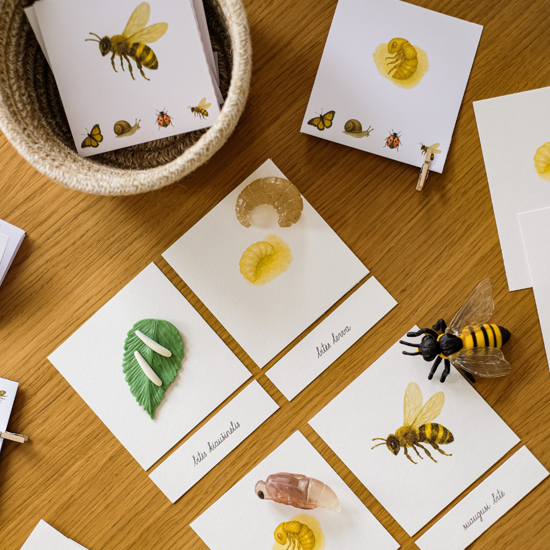 - trijų dalių Montessori korteles kiekvienam iš 4 vabaliukų;