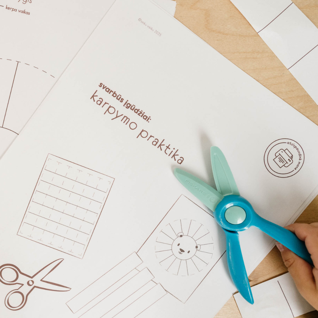 Kai vaikas naudoja žirkles, jis daro kur kas daugiau nei tik kerpa popierių: