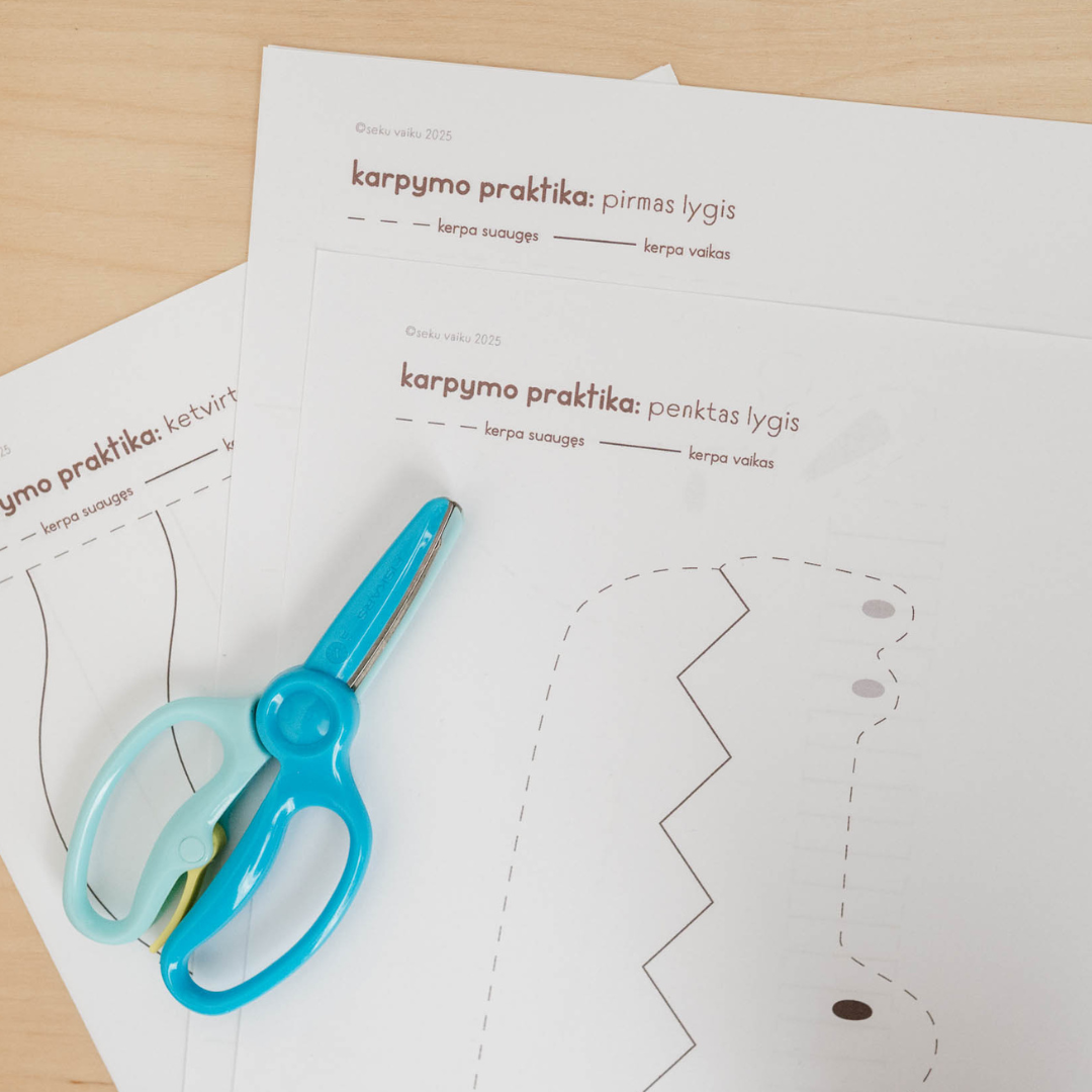 Užduotėlių rinkinyje rasite net 5 lygių veiklas karpymo praktikai, tad vaikas galės progresuoti savu tempu.