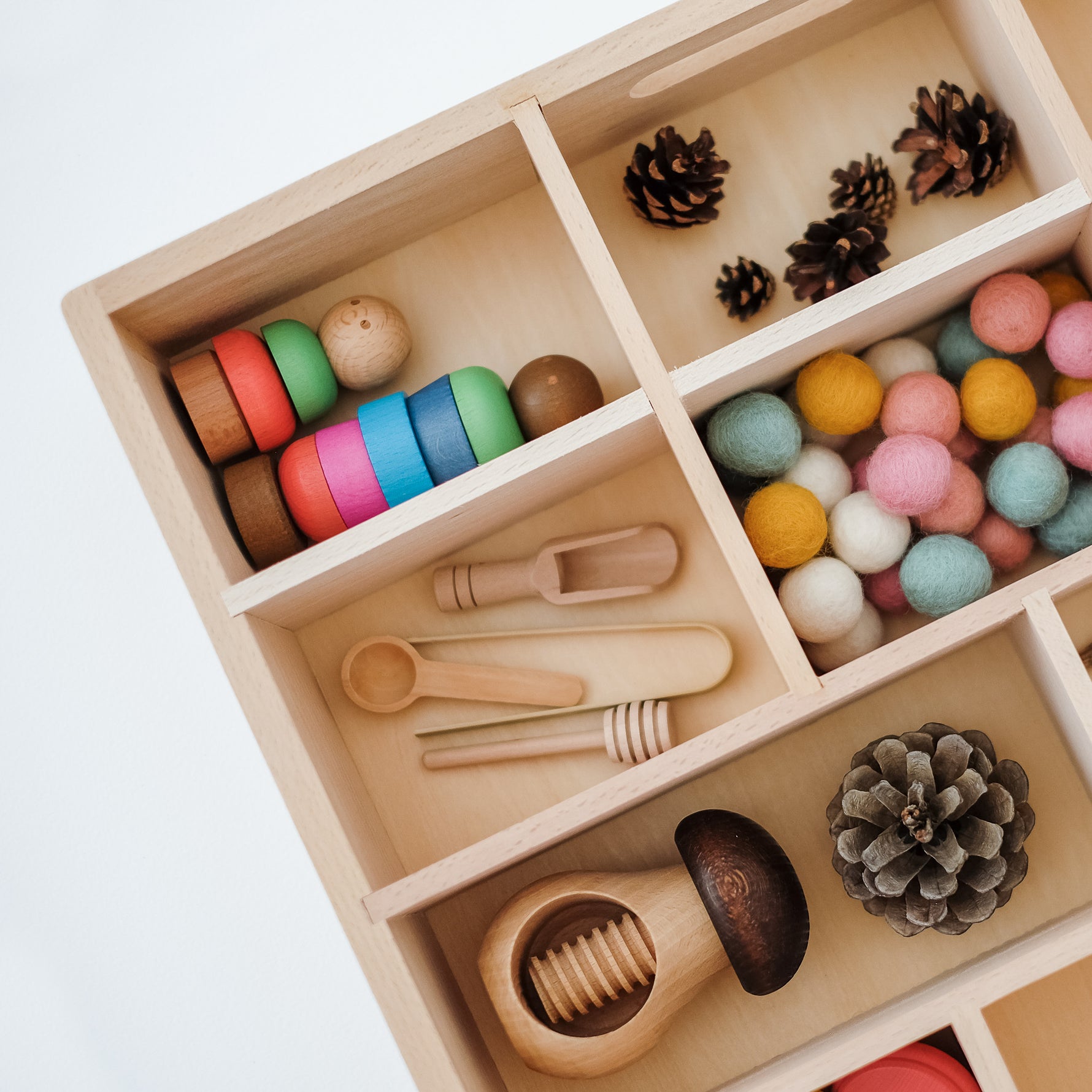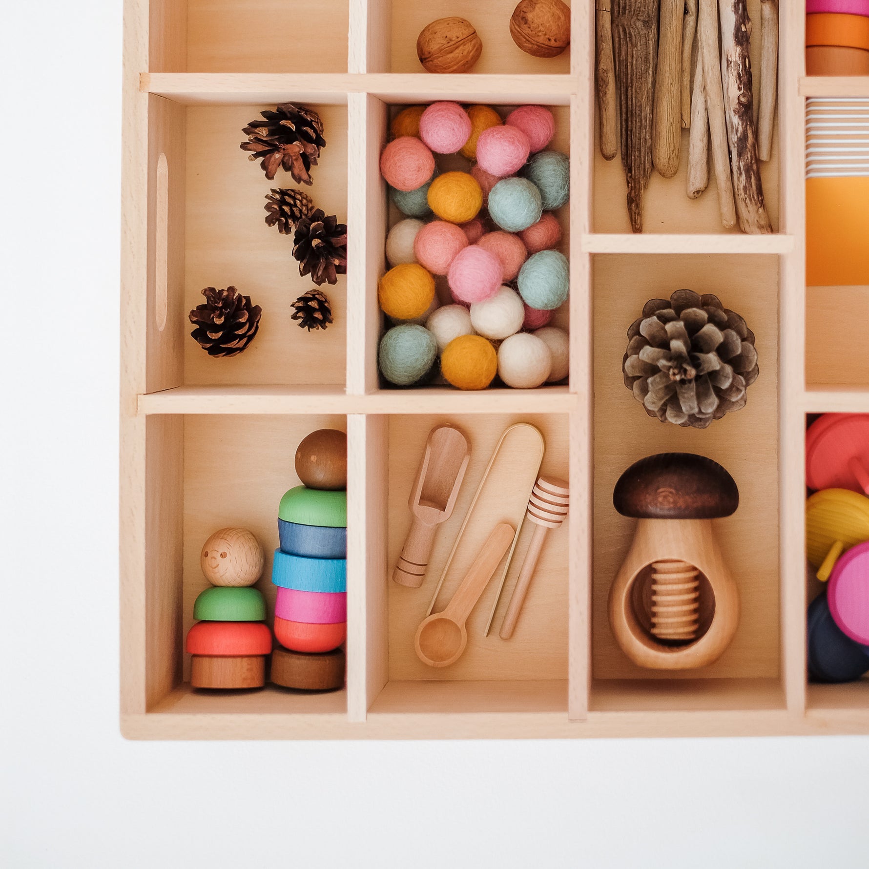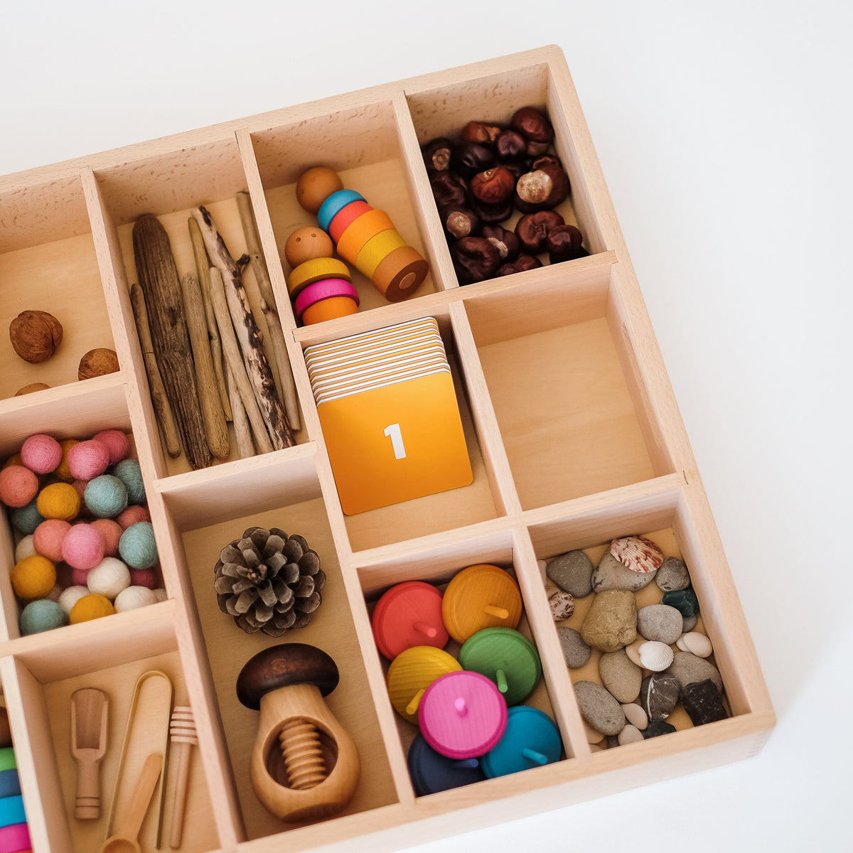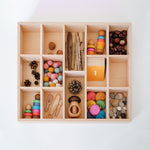 Gražus ir tvirtas buko medžio padėklas turi net 14 skyrių bei rankenas, tad patogu jį perkelti iš vienos vietos į kitą. O toks atviras priemonių pateikimas tik ir kviečia vaikus užsiimti, kurti bei žaisti.